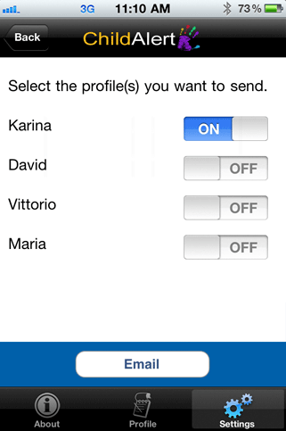 The Child Alert application allows you to easily create and store your child's digital profile directly on your cell phone, so you can carry it with you wherever you go. Time is precious in case of an emergency. With Child Alert you can instantly email your child's profile to proper authority thereby allowing you to gain valuable time and consequently permitting authorities to treat the emergency much more expeditiously. The application also prompts you to update the stored information at a frequency of your choosing so that the profile is constantly kept up to date. Child Alert is an essential tool for all caring parents.