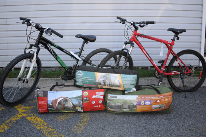 Vers 1h50, un citoyen contacte le 911 concernant une intrusion de nuit par 2 suspects dans le secteur de la rue Sainte-Marie à Saint-Constant. Le véhicule utilisé par un des suspects a été localisé par les policiers dans la cour d’une résidence privée de Saint-Constant, sans occupant à bord. L’enquête policière a mené à la saisie des biens se trouvant dans la boîte arrière de la camionnette et l’accusation de son propriétaire pour intrusion de nuit. À ce jour, aucun propriétaire n’a rapporté le vol des biens saisis apparaissant sur la photo suivante. Il s’agit de 2 vélos et de trois tentes dans leurs étuis.